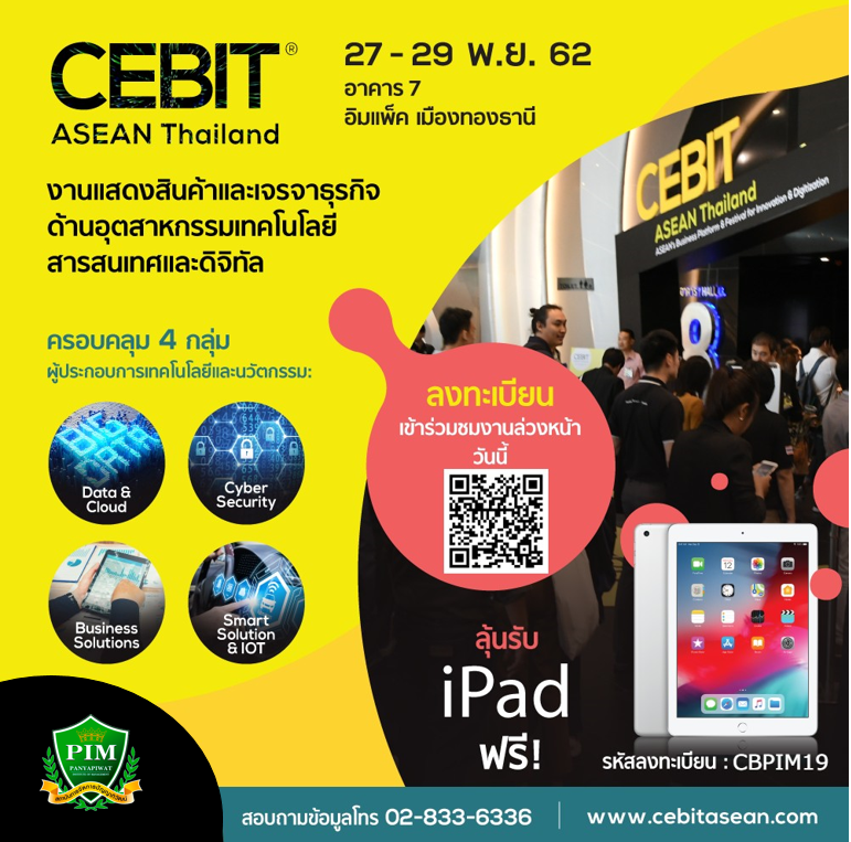 เมษายน 1, 2020ที่สุดแห่งปีในงาน CEBIT ASEAN Thailand 2019 งานแสดงสินค้าและเจรจาธุรกิจในอุตสาหกรรมเทคโนโลยีสารสนเทศและดิจิทัลแห่งอาเซียนหลักสูตร MBA สถาบันการจัดการปัญญาภิวัฒน์ ขอเรียนเช…