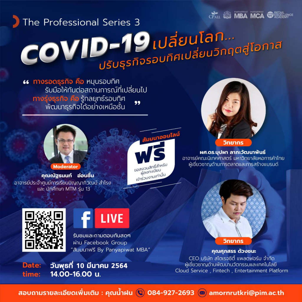 หลังสถานการณ์ Covid-19 อะไร อะไร ก็เปลี่ยนไป!!! พร้อมรับมือทุกการเปลี่ยนแปลงของตลาดธุรกิจ การสื่อสารการตลาดและเทคโนโลยีที่ทันสมัย พบกับงานสัมมนาออนไลน์(ฟรี) The Professional Series 3 จัดโดยหลักสูตรบริหารธุรกิจมหาบัณฑิตร่วมกับหลักสูตรนิเทศศาสตรมหาบัณฑิต สถาบันการจัดการปัญญาภิวัฒน์ ในหัวข้อ“Covid-19 เปลี่ยนโลก…ปรับธุรกิจรอบทิศเปลี่ยนวิกฤตสู่โอกาส”